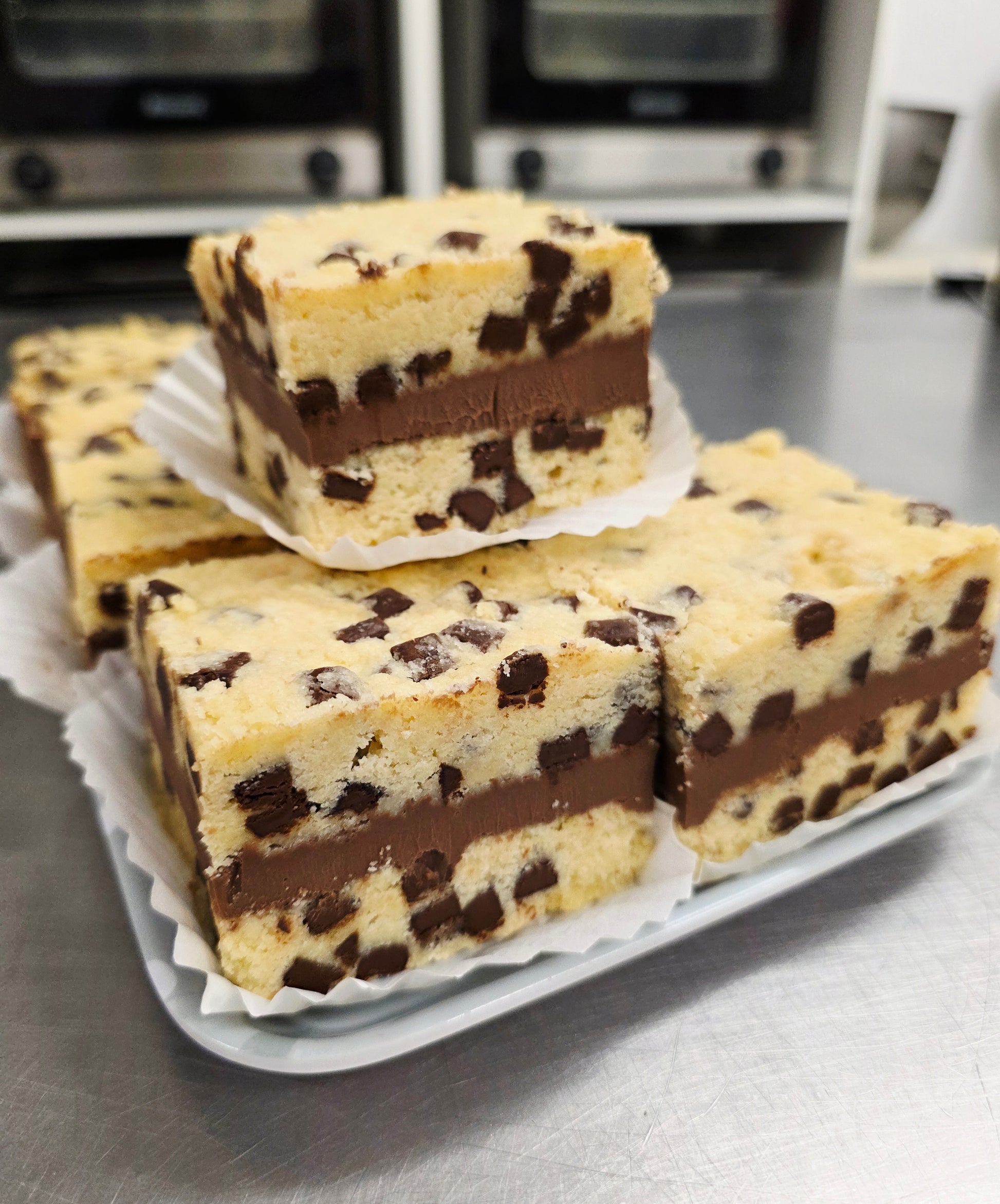 A huge slice of choc chunk shortbread sandwiched together with creamy chocolate.