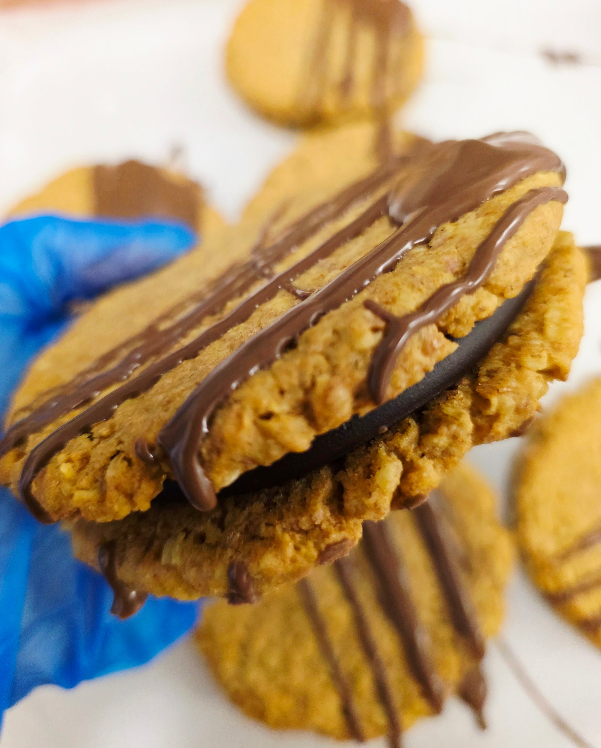 Two soft, chewy, oaty biscuits sandwiched with decadent ganache!